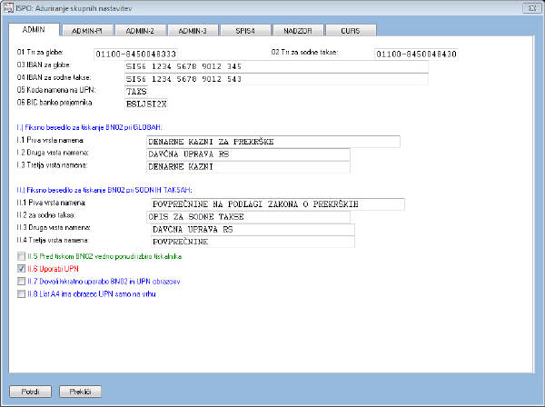V Admin modulu, do katerega ima pravico dostopa samo ustrezna pooblaščena oseba, je mogoče definirati nastavitve, ki veljajo za prkrškovni organ v celoti. Praviloma se te nastavitve vnesejo ob namestitvi sistema in se spreminjajo samo izjemoma.